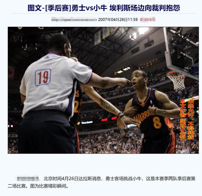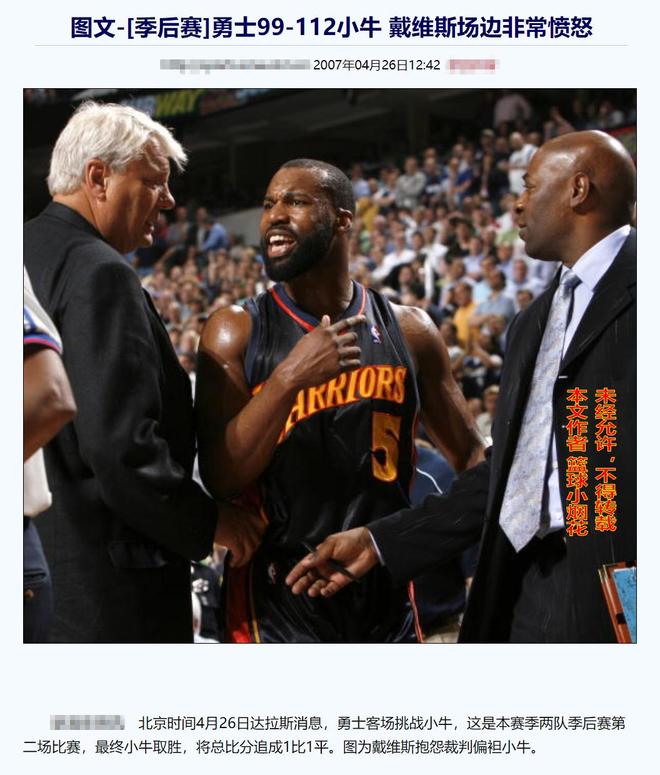 2007年西部季后賽首輪的揭幕戰,勇士在所有人都不看好的情況下,以95:85擊敗了達拉斯小牛,大比分1:0領先,在第二戰開戰前,有一個背景需要在這里說一下。