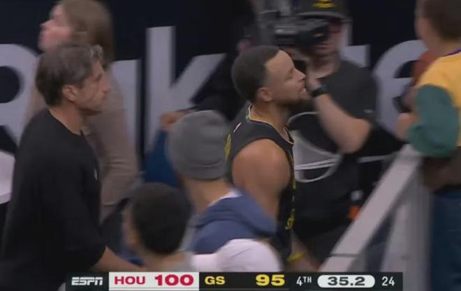 第四節比賽的時候,庫里突然被阿門·湯普森撞倒,傷到了自己的右腿,被迫提前退出比賽,直接回到了更衣室。