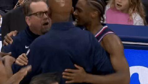 次節(jié)比賽,奧孔古暴扣引領老鷹追到僅差1分,格萊姆斯三分命中,老鷹繼續(xù)反撲追到僅差2分。76人連得3分,老鷹一波10-4攻勢反超1分,雙方隨后交替領先纏斗至50-50。76人連得4分,老鷹再度反超1分,馬克西造犯規(guī)兩罰全中,上半場結束76人58-57領先老鷹。前兩節(jié)比賽,76人三分17中5,76人3人得分上雙,馬克西13+4+5、恩比德11分與格萊姆斯12分,老鷹三分20中4,杰倫16+7與蓋耶11分。